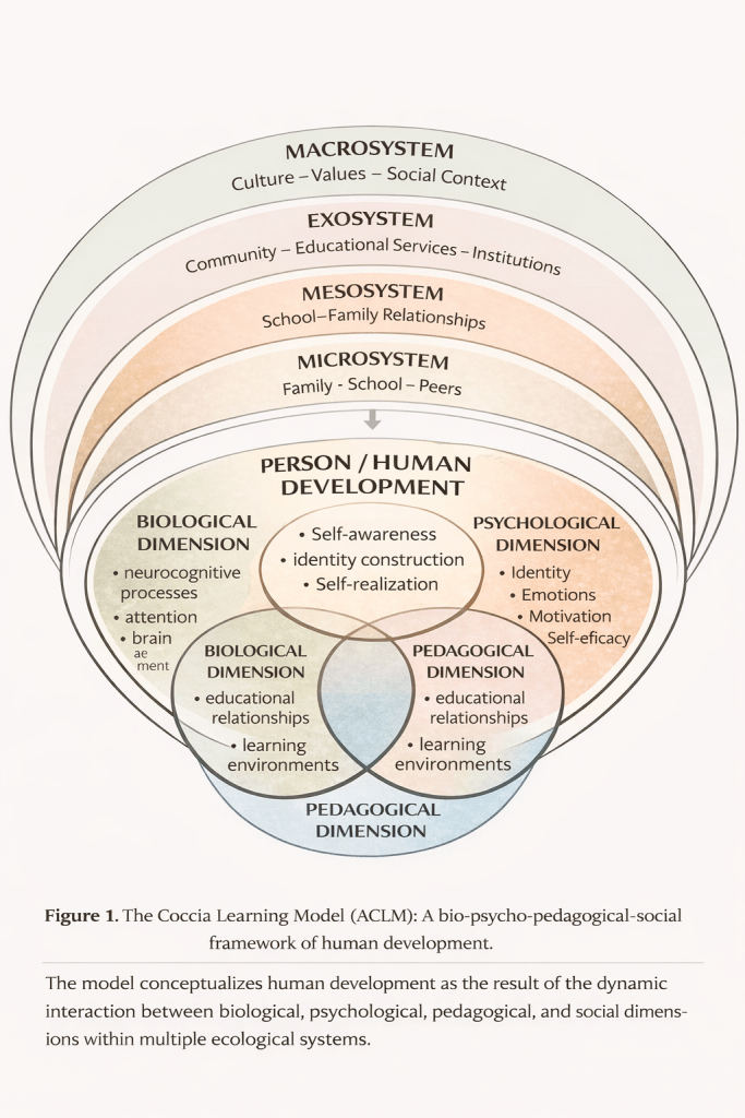 The Coccia Method (ACLM) was developed in response to this need. The model proposes an integrated bio-psycho-pedagogical framework that conceptualizes human development as the result of dynamic interactions between biological, psychological, pedagogical, and social dimensions. By placing the individual at the center of the educational process, the method emphasizes the role of educational relationships, identity development, and personal transformation in learning environments.
